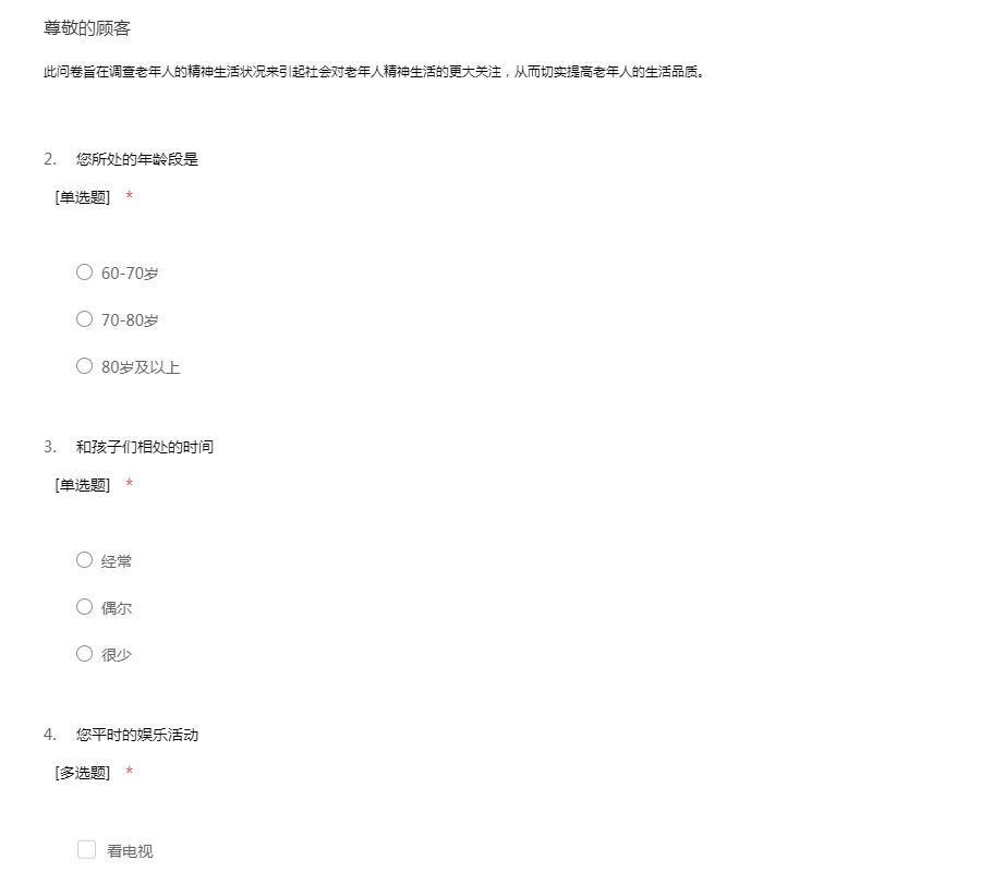 此问卷旨在调查老年人的精神生活状况来引起社会对老年人精神生活的更大关注,从而切实提高老年人的生活品质。