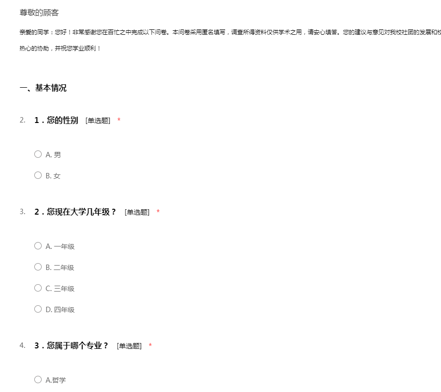 亲爱的同学:您好!非常感谢您在百忙之中完成以下问卷。本问卷采用匿名填写,调查所得资料仅供学术之用,请安心填答。您的建议与意见对我校社团的发展和校园文化的丰富有着重要的促进作用。再次谢谢您热心的协助,并祝您学业顺利!