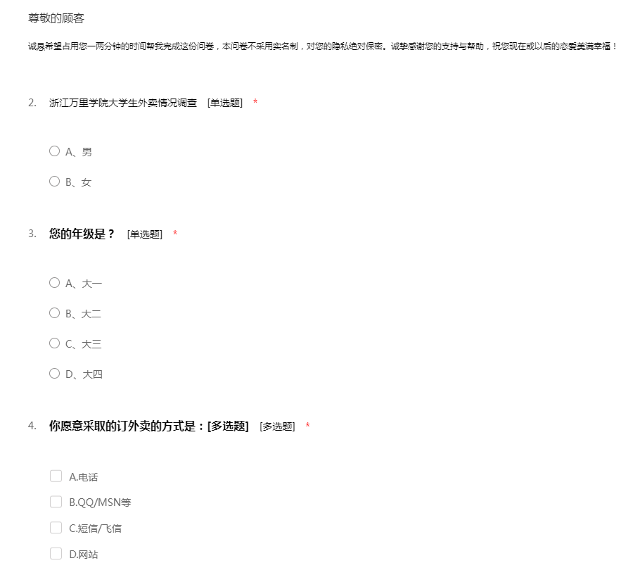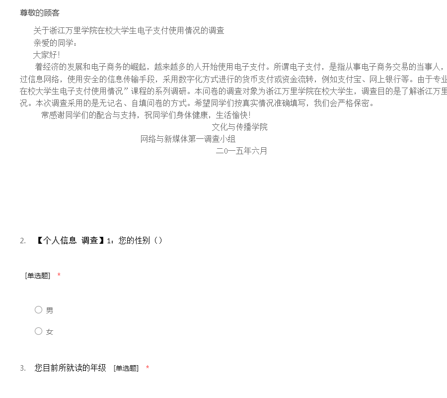 着经济的发展和电子商务的崛起,越来越多的人开始使用电子支付。所谓电子支付,是指从事电子商务交易的当事人,包括消费者、厂商和金融机构,通过信息网络,使用安全的信息传输手段,采用数字化方式进行的货币支付或资金流转,例如支付宝、网上银行等。由于专业需要,我们要开展“浙江万里学院在校大学生电子支付使用情况”课程的系列调研。本问卷的调查对象为浙江万里学院在校大学生,调查目的是了解浙江万里学院在校大学生电子支付使用情况。本次调查采用的是无记名、自填问卷的方式。希望同学们按真实情况准确填写,我们会严格保密。