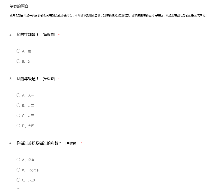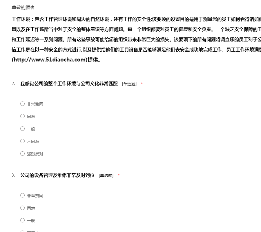 工作环境:包含工作管理环境和周边的自然环境,还有工作的安全性:该要项的设置目的是用于测量您的员工如何看待诸如他们的工作环境条件、设备工具的质量以及在工作场所当中对于安全的整体意识等方面问题。每一个组织都要对员工的健康和安全负责。一个缺乏安全保障的工作环境将导致各类事故、法律诉讼和工作延迟等一系列问题。所有这些事故可能给您的组织带来非常巨大的损失。该要项下的所有问题将调查您的员工对于公司的设施工具是否满意,他们是否相信工作是在以一种安全的方式进行,以及提供给他们的工具设备是否能够满足他们去安全成功地完成工作。员工工作环境满意度问卷模板由我要调查网(http://www.51diaocha.com)提供。