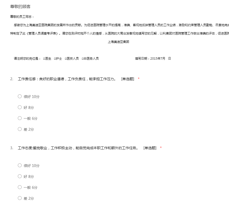 上海美迪亚医院集团2015年中管理人员调查考评表