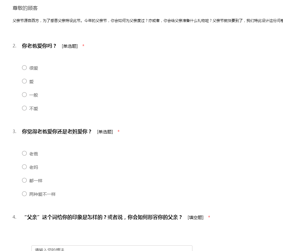 父亲节源自西方,为了感恩父亲特设此节。今年的父亲节,你会如何为父亲度过?亦或者,你会给父亲准备什么礼物呢?父亲节就快要到了,我们特此设计这份问卷,看看大家有啥好的建议,一起分享出来吧!