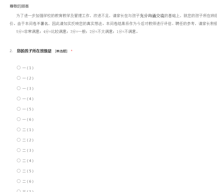 为了进一步加强学校的教育教学及管理工作,改进不足,请家长在与孩子充分沟通交流的基础上,就您的孩子所在班级班主任和任课教师的工作做出评价。由于本问卷不署名,因此请如实反映您的真实想法。本问卷结果将作为今后对教师进行评估、聘任的参考,请家长积极参与学校的管理。 5分=非常满意;4分=比较满意;3分=一般;2分=不太满意;1分=不满意。