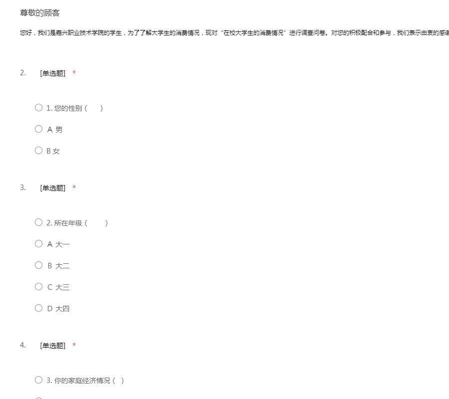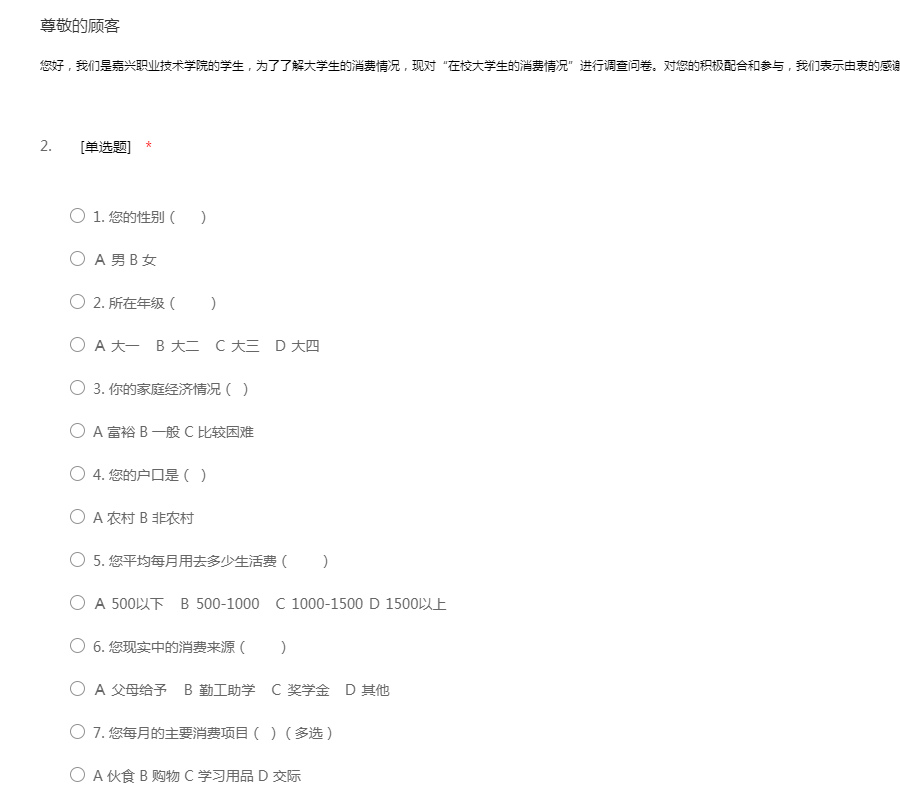 您好,我们是嘉兴职业技术学院的学生,为了了解大学生的消费情况,现对“在校大学生的消费情况”进行调查问卷。对您的积极配合和参与,我们表示由衷的感谢。