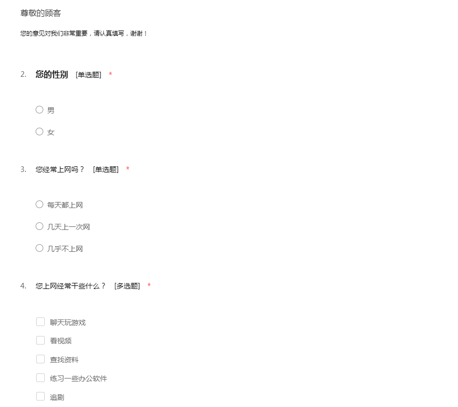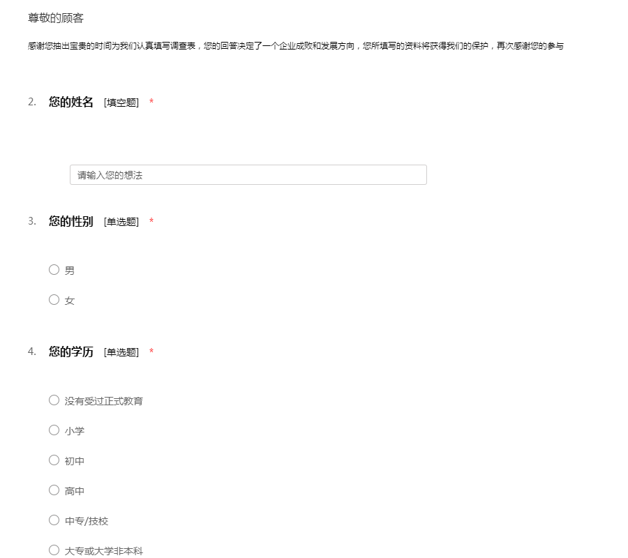 感谢您抽出宝贵的时间为我们认真填写调查表,您的回答决定了一个企业成败和发展方向,您所填写的资料将获得我们的保护,再次感谢您的参与