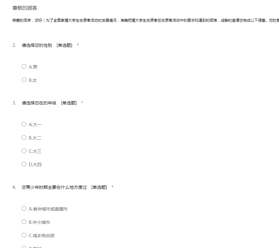 亲爱的同学,您好!为了全面掌握大学生志愿者活动的发展情况,准确把握大学生志愿者在志愿者活动中的需求和遇到的困难,诚挚的邀请您完成以下调查。您的意见对我们非常重要,请认真填写,谢谢