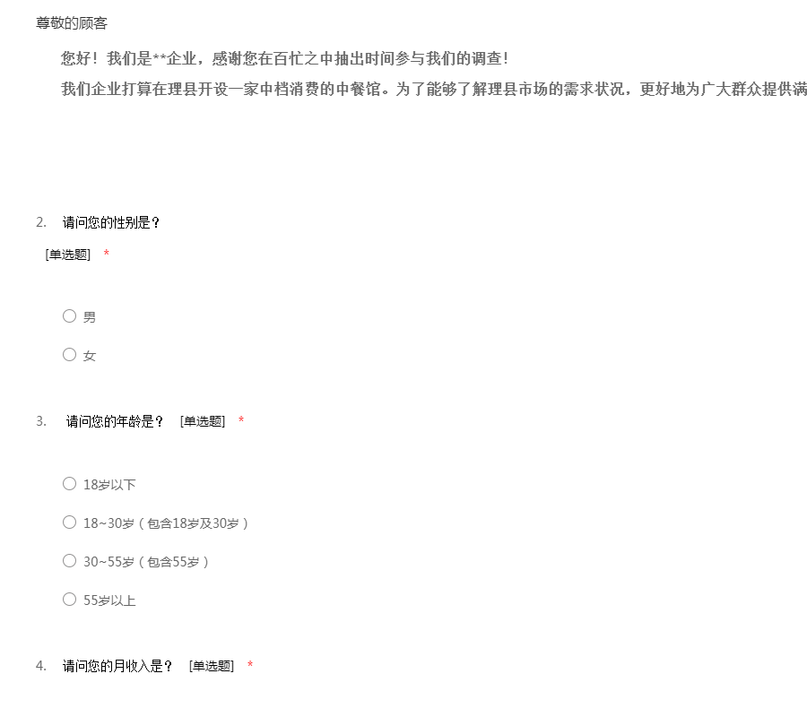 您好!我们是**企业,感谢您在百忙之中抽出时间参与我们的调查! 我们企业打算在理县开设一家中档消费的中餐馆。为了能够了解理县市场的需求状况,更好地为广大群众提供满意的服务,特开设此次调查活动.