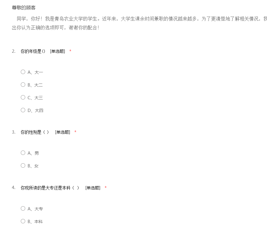 同学,你好!我是青岛农业大学的学生。近年来,大学生课余时间兼职的情况越来越多,为了更清楚地了解相关情况,我们特此进行此次调查。在括号内选出你认为正确的选项即可,谢谢你的配合!