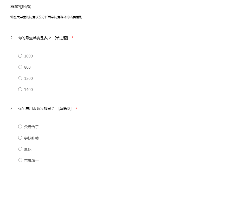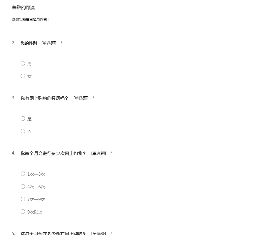 尊敬的先生/女士:您好!非常感谢您参与本次答卷!我们正在进行一项有关大学生网上消费能力的小调查。您的观点和意见会被严格保密,最终仅被用于汇总后的统计分析,请您放心填写。