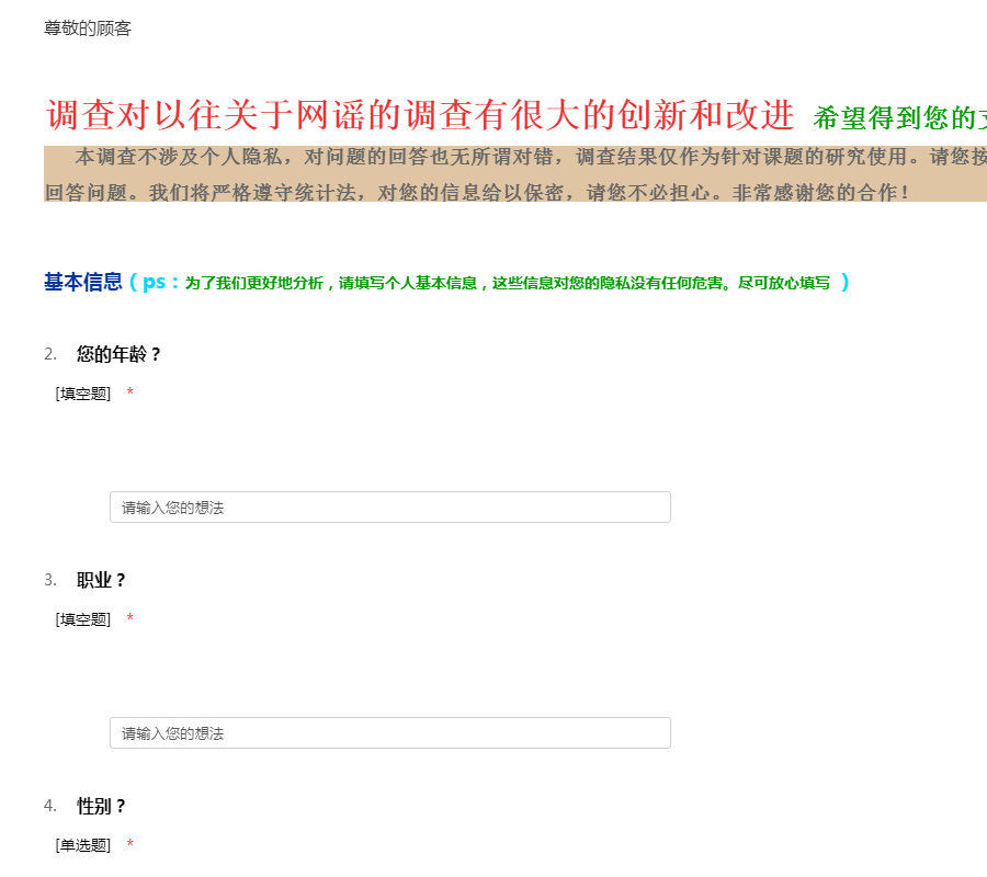您好!我们是“广外艺”的学生,为了了解与网络谣言相关的问题,我们组织了这次活动。本次调查对以往关于网谣的调查有很大的创新和改进,希望得到您的支持和协助。 本调查不涉及个人隐私,对问题的回答也无所谓对错,调查结果仅作为针对课题的研究使用。请您按照实际情况和自己的真实想法回答问题。我们将严格遵守统计法,对您的信息给以保密,请您不必担心。非常感谢您的合作!