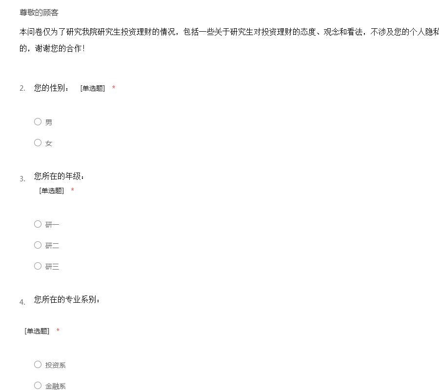 本问卷仅为了研究我院研究生投资理财的情况,包括一些关于研究生对投资理财的态度、观念和看法,不涉及您的个人隐私,调查结果用于纯调查研究性目的,谢谢您的合作!