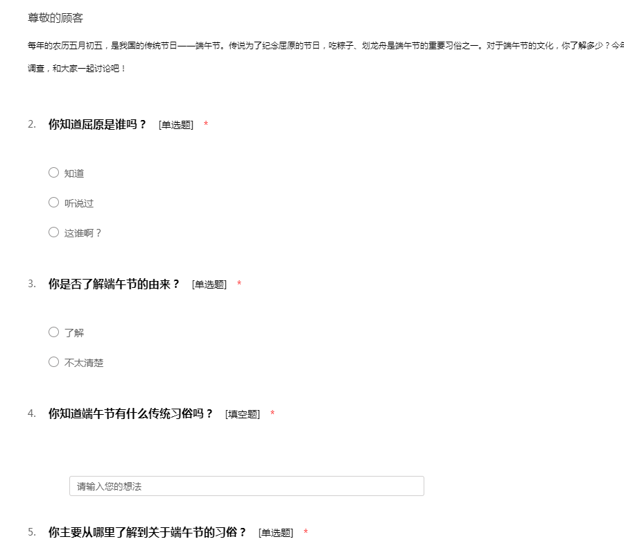 每年的农历五月初五,是我国的传统节日——端午节。传说为了纪念屈原的节日,吃粽子、划龙舟是端午节的重要习俗之一。对于端午节的文化,你了解多少?今年的端午节你又会如何度过?快来参加我们的问卷调查,和大家一起讨论吧!