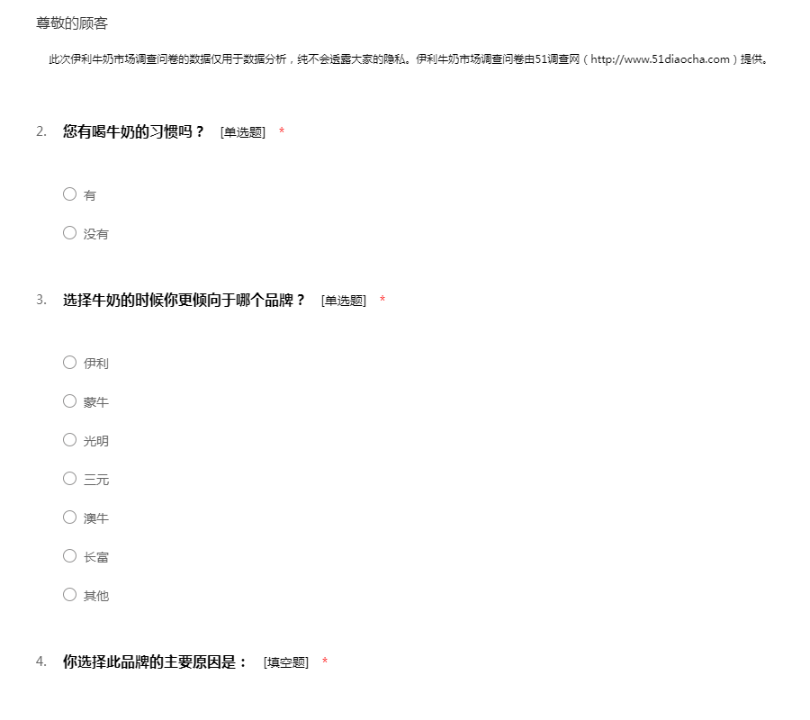 此次伊利牛奶市场调查问卷的数据仅用于数据分析,纯不会透露大家的隐私。伊利牛奶市场调查问卷由51调查网(http://www.51diaocha.com)提供。