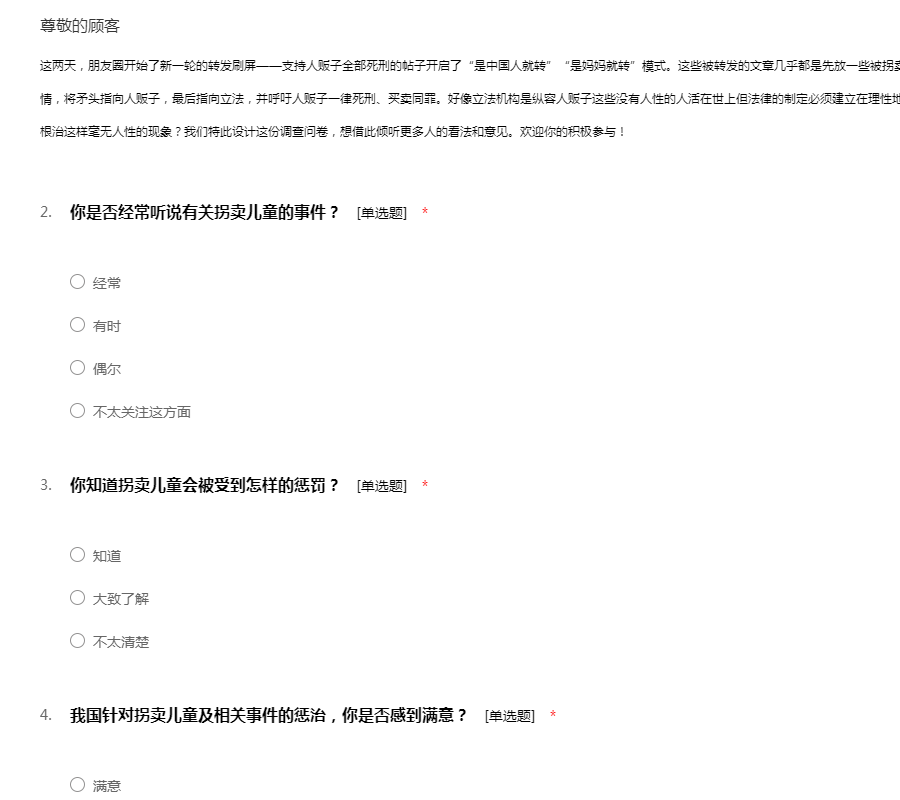 这两天,朋友圈开始了新一轮的转发刷屏——支持人贩子全部死刑的帖子开启了“是中国人就转”“是妈妈就转”模式。这些被转发的文章几乎都是先放一些被拐卖儿童惨状及父母伤心欲绝的照片以激发读者的同情,将矛头指向人贩子,最后指向立法,并呼吁人贩子一律死刑、买卖同罪。好像立法机构是纵容人贩子这些没有人性的人活在世上但法律的制定必须建立在理性地基础上。对于人贩子,到底应该如何处罚,才能根治这样毫无人性的现象?我们特此设计这份调查问卷,想借此倾听更多人的看法和意见。欢迎你的积极参与!