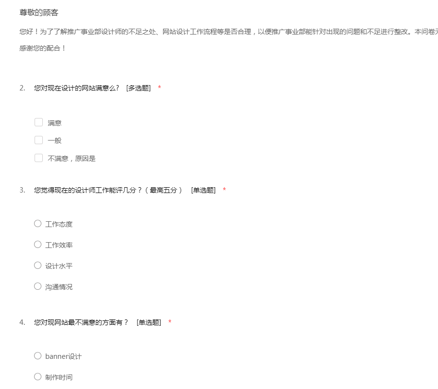 您好!为了了解推广事业部设计师的不足之处、网站设计工作流程等是否合理,以便推广事业部能针对出现的问题和不足进行整改。本问卷无须填写姓名,所以请放心的如实填写。感谢您的配合!