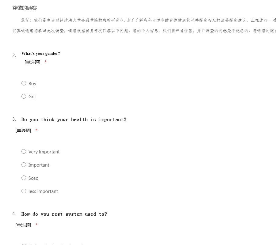 您好!我们是中南财经政法大学金融学院的在校研究生,为了了解当今大学生的身体健康状况并提出相应的改善提出建议,正在进行一项关于我校大学生饮食习惯现状的调查。我们真诚邀请您参与此次调查,请您根据自身情况回答以下问题。您的个人信息,我们将严格保密,并且调查的问卷是不记名的。感谢您的配合与支持!
