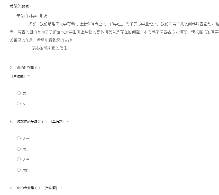 亲爱的同学、朋友: 您好!我们是理工大学劳动与社会保障专业大二的学生,为了完成学业论文,我们开展了此次问卷调查活动。这是针对大学生网上购物的一份调查问卷,调查的目的是为了了解当代大学生网上购物的整体情况以及存在的问题。本问卷采取匿名方式填写,请根据您的真实意愿填写。您的答案将对我们产生至关重要的作用,希望能得到您的支持。 衷心的感谢您的信任!