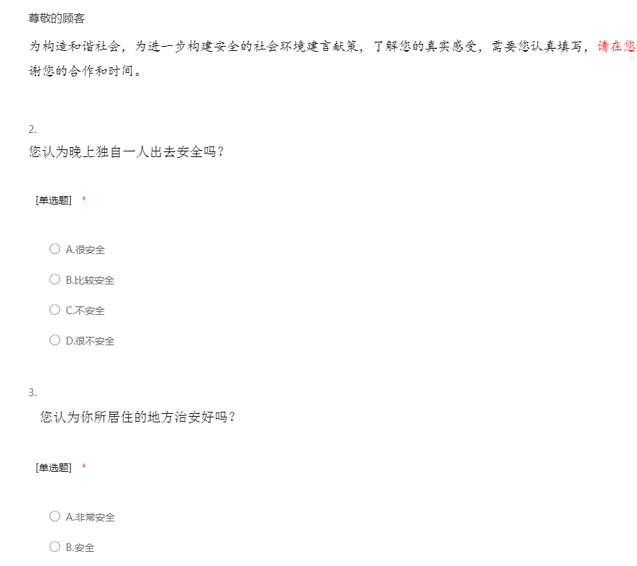 为构造和谐社会,为进一步构建安全的社会环境建言献策,了解您的真实感受,需要您认真填写,请在您认为最合理的答案上打勾,谢谢您的合作和时间。
