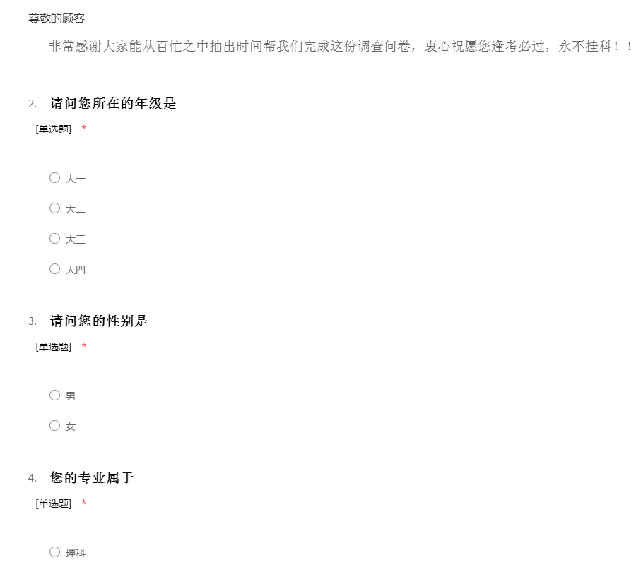非常感谢大家能从百忙之中抽出时间帮我们完成这份调查问卷,衷心祝愿您逢考必过,永不挂科!!!