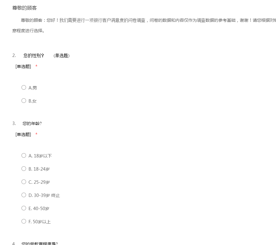 尊敬的顾客:您好!我们需要进行一项银行客户满意度的问卷调查,问卷的数据和内容仅作为调查数据的参考基础,谢谢!请您根据对银行的真实感受,对下面的指标要素的满意程度进行选择。