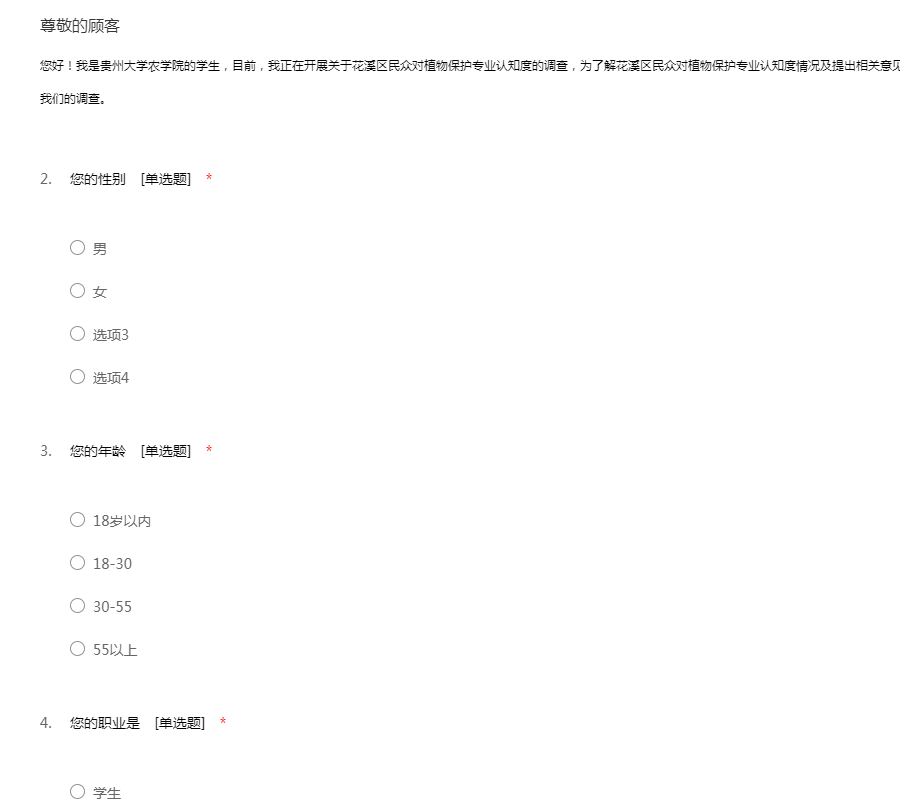 您好!我是贵州大学农学院的学生,目前,我正在开展关于花溪区民众对植物保护专业认知度的调查,为了解花溪区民众对植物保护专业认知度情况及提出相关意见。希望您能填写您的真实的想法,感谢您能配合我们的调查。