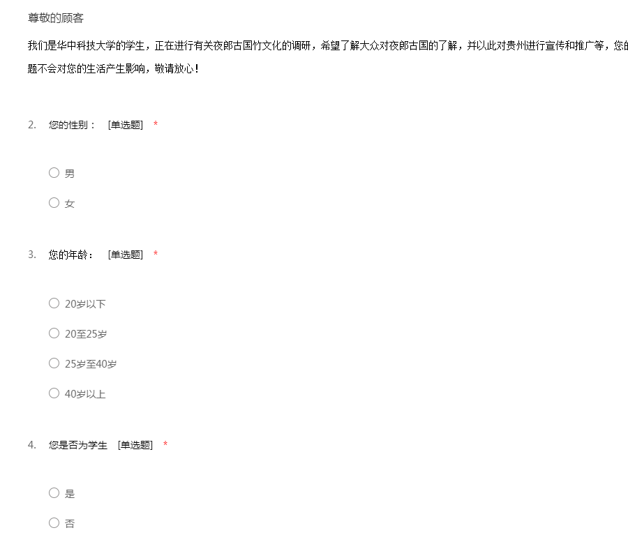 我们是华中科技大学的学生,正在进行有关夜郎古国竹文化的调研,希望了解大众对夜郎古国的了解,并以此对贵州进行宣传和推广等,您的回答将会给予我们很大的帮助,这些问题不会对您的生活产生影响,敬请放心!