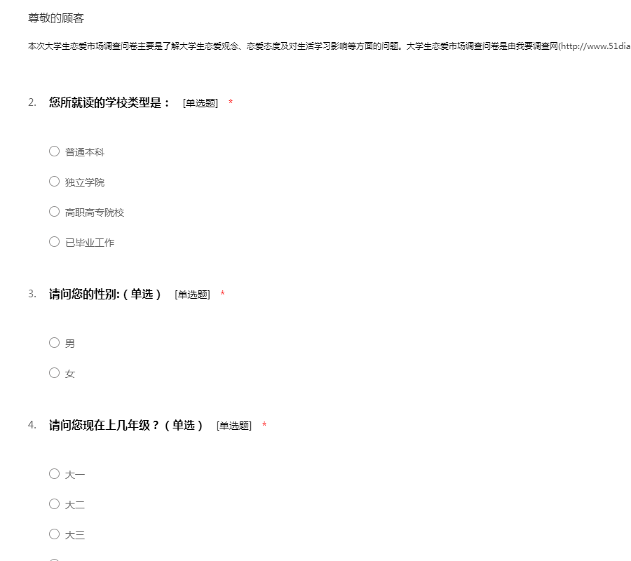 本次问卷调查意在了解当代大学生的恋爱实际情况,您的真实回答对我们来说十分宝贵!感谢您在百忙之中回答此卷!51调查网(我要调查网)谢谢您的参与。