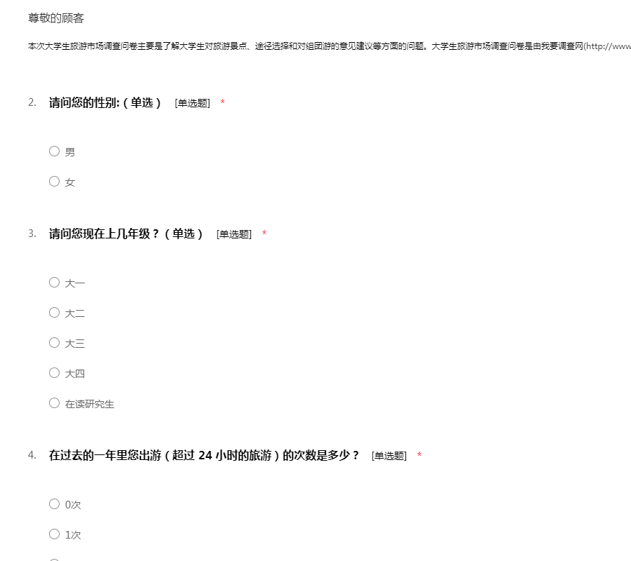 本次大学生旅游市场调查问卷主要是了解大学生对旅游景点、途径选择和对组团游的意见建议等方面的问题。大学生旅游市场调查问卷是由我要调查网(http://www.51diaocha.com)提供。