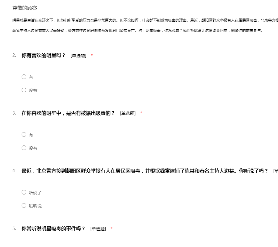 明星总是生活在光环之下,但他们所承受的压力也是非常巨大的。但不论如何,什么都不能成为吸毒的理由。最近,朝阳区群众举报有人在居民区吸毒,北京警方根据线索逮捕了吸毒者陈某。据陈某供述同小区的著名主持人边某有重大涉毒嫌疑,警方前往边某房间喝茶发现其已坠楼身亡。对于明星吸毒,你怎么看?我们特此设计这份调查问卷,期望你的前来参与。