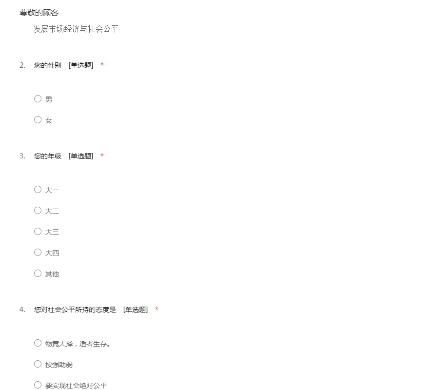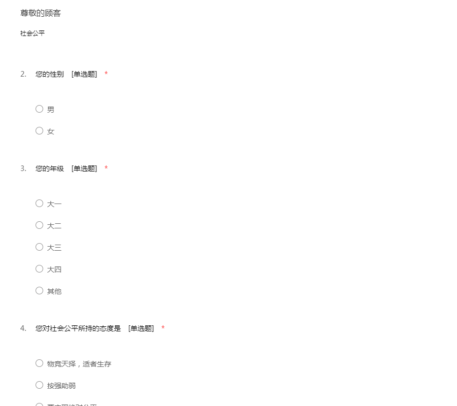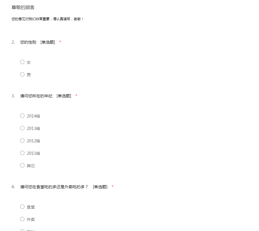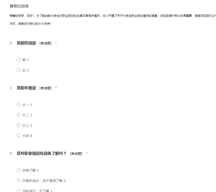 亲爱的同学,您好! 为了解当前大学生对职业规划的态度及其相关情况,本人开展了关于大学生职业规划情况的调查,您的回答对我们非常重要,感谢您在百忙之中抽出时间来完成这份问卷,本问卷采取不记名方式,感谢您对我们的大力支持!