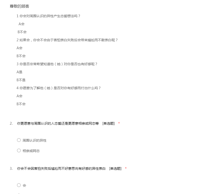 1 你会对周围认识的异性产生恋爱想法吗? A会 B不会 2 如果会,你会不会由于害怕表白失败后会带来尴尬而不敢表白呢? A会 B不会 3 你是否非常希望知道他(她)对你是否也有好感呢? A是 B不是 4 你愿意为了解他(她)是否对你有好感而付出什么吗? A会 B不会