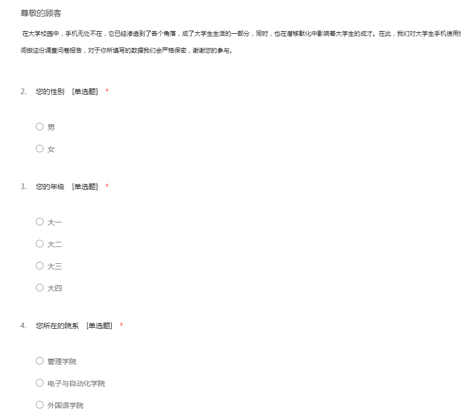 在大学校园中,手机无处不在,它已经渗透到了各个角落,成了大学生生活的一部分,同时,也在潜移默化中影响着大学生的成才。在此,我们对大学生手机使用情况进行调查,感谢你在百忙之中抽出宝贵的时间做这份调查问卷报告,对于你所填写的数据我们会严格保密,谢谢您的参与。