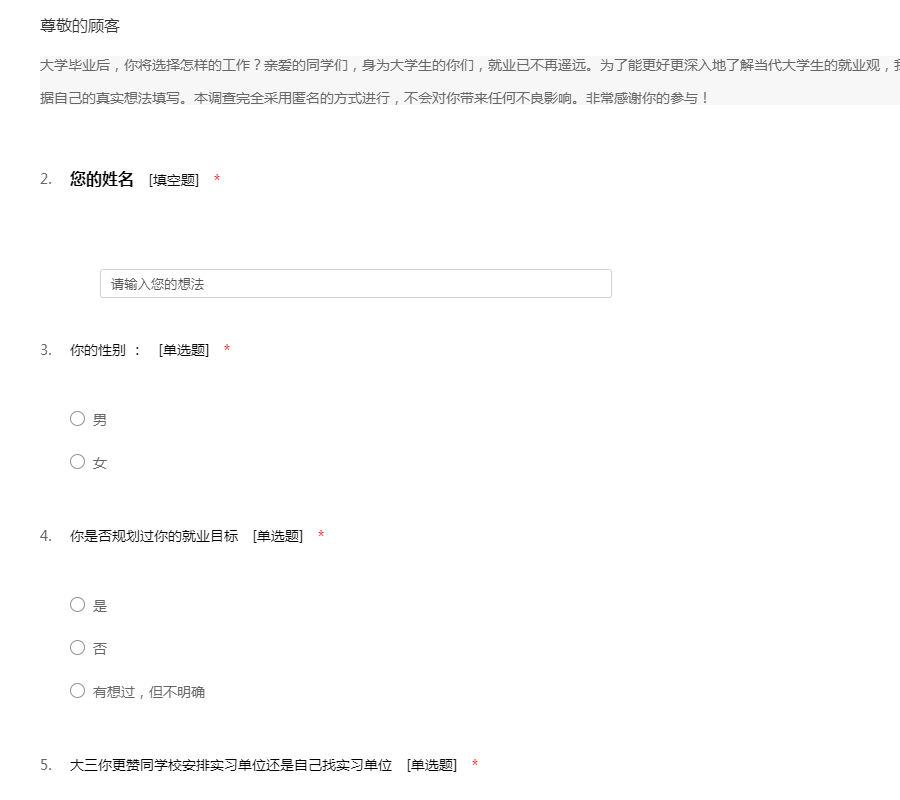 大学毕业后,你将选择怎样的工作?亲爱的同学们,身为大学生的你们,就业已不再遥远。为了能更好更深入地了解当代大学生的就业观,我们在问卷上提出了几个问题,希望你根据自己的真实想法填写。本调查完全采用匿名的方式进行,不会对你带来任何不良影响。非常感谢你的参与!