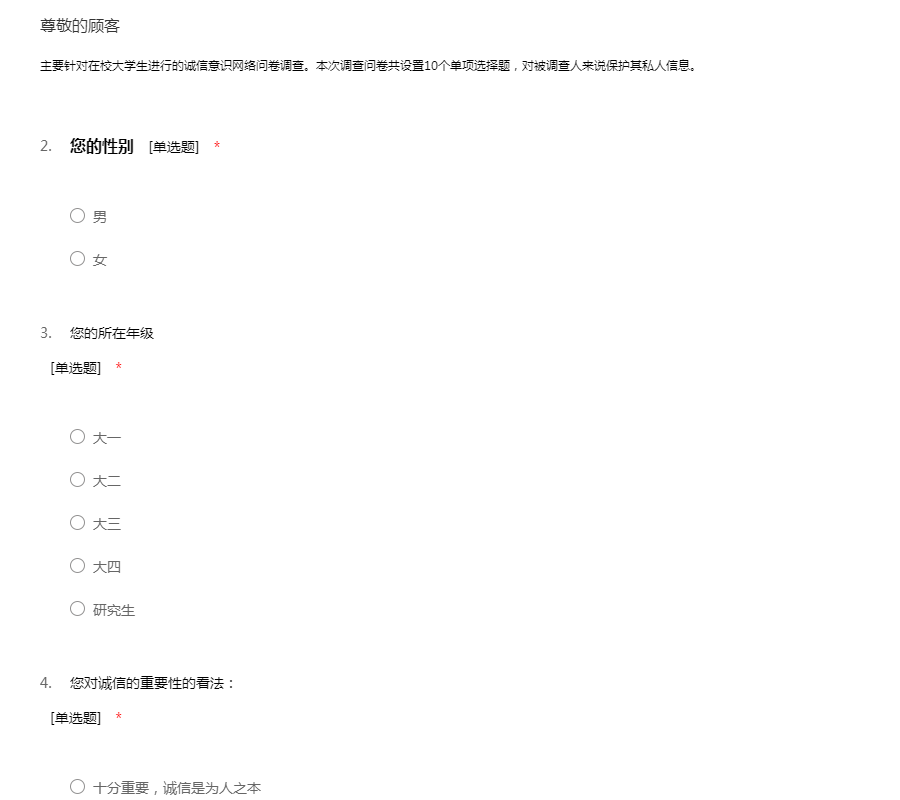 主要针对在校大学生进行的诚信意识网络问卷调查。本次调查问卷共设置10个单项选择题,对被调查人来说保护其私人信息。
