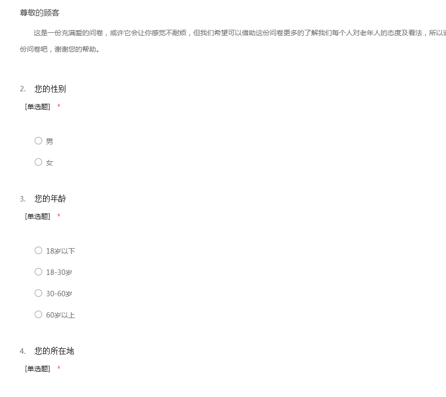 这是一份充满爱的问卷,或许它会让你感觉不耐烦,但我们希望可以借助这份问卷更多的了解我们每个人对老年人的态度及看法,所以请您花费几分钟的时间,来认真的填写这份问卷吧,谢谢您的帮助。