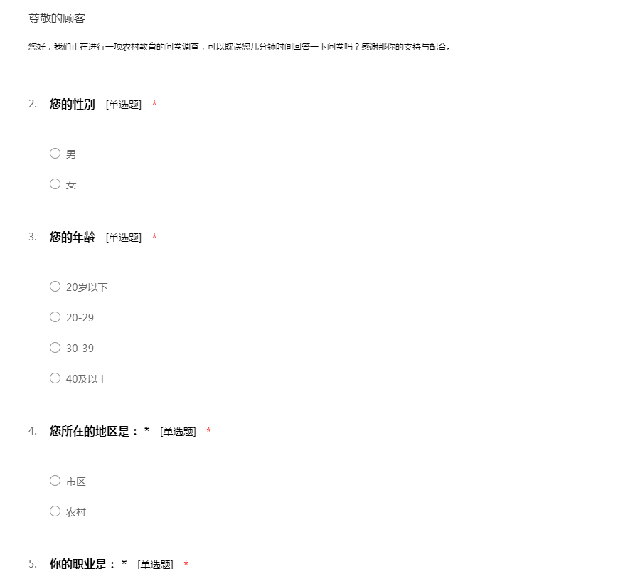 您好,我们正在进行一项农村教育的问卷调查,可以耽误您几分钟时间回答一下问卷吗?感谢那你的支持与配合。