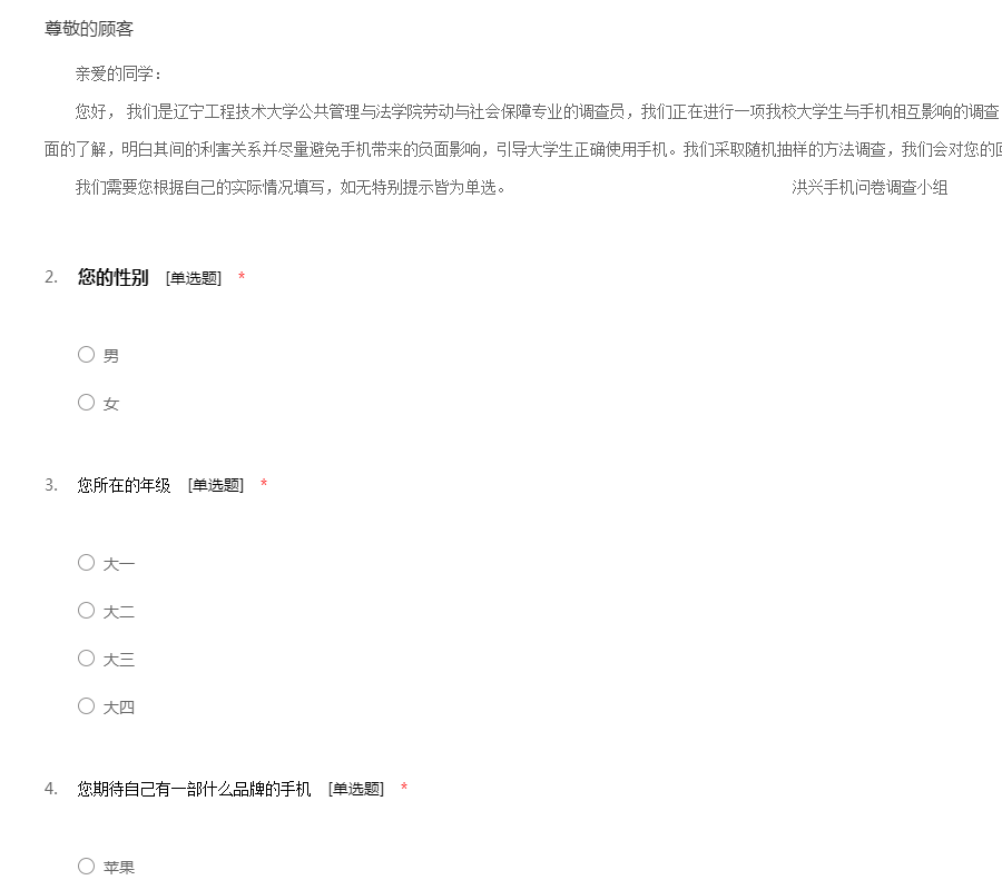 亲爱的同学: 您好, 我们是辽宁工程技术大学公共管理与法学院劳动与社会保障专业的调查员,我们正在进行一项我校大学生与手机相互影响的调查,旨在促使我校大学生对手机使用有较全面的了解,明白其间的利害关系并尽量避免手机带来的负面影响,引导大学生正确使用手机。我们采取随机抽样的方法调查,我们会对您的回答严格保密,感谢您的支持与配合! 我们需要您根据自己的实际情况填写,如无特别提示皆为单选。 洪兴手机问卷调查小组
