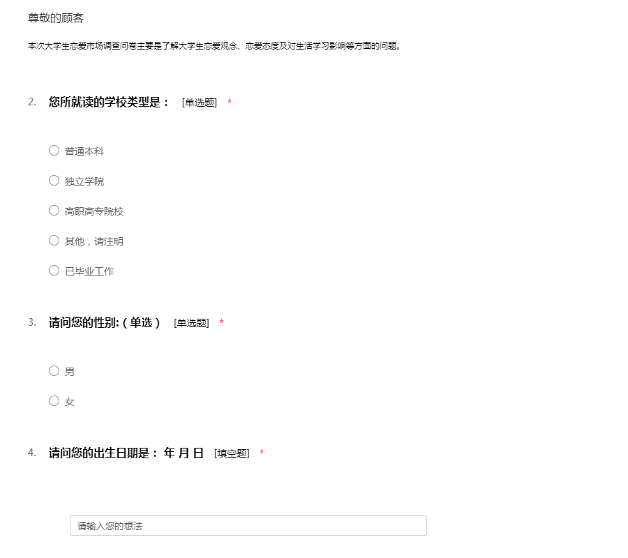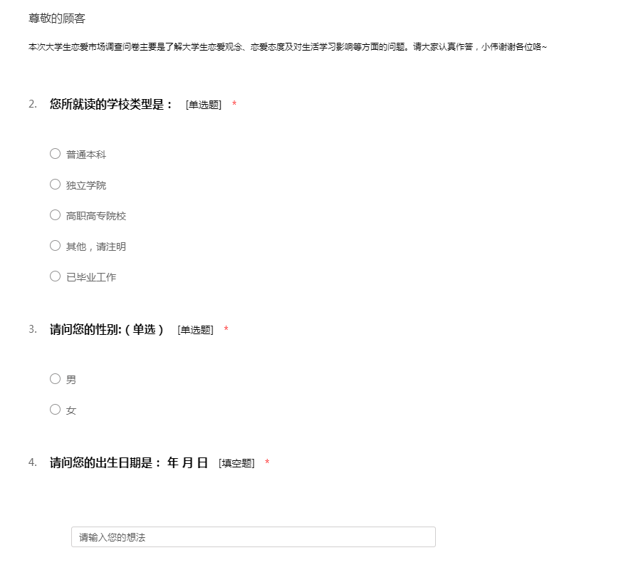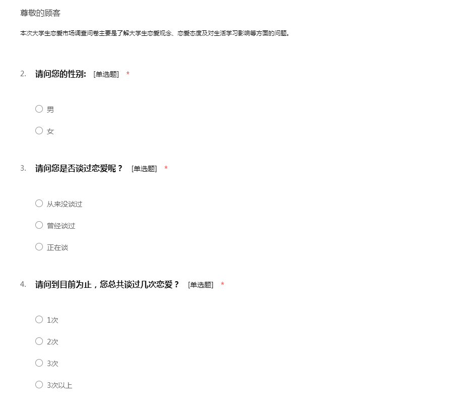 本次大学生恋爱市场调查问卷主要是了解大学生恋爱观念、恋爱态度及对生活学习影响等方面的问题。