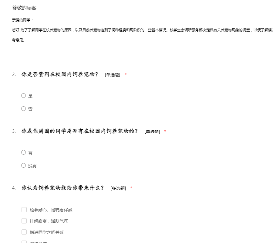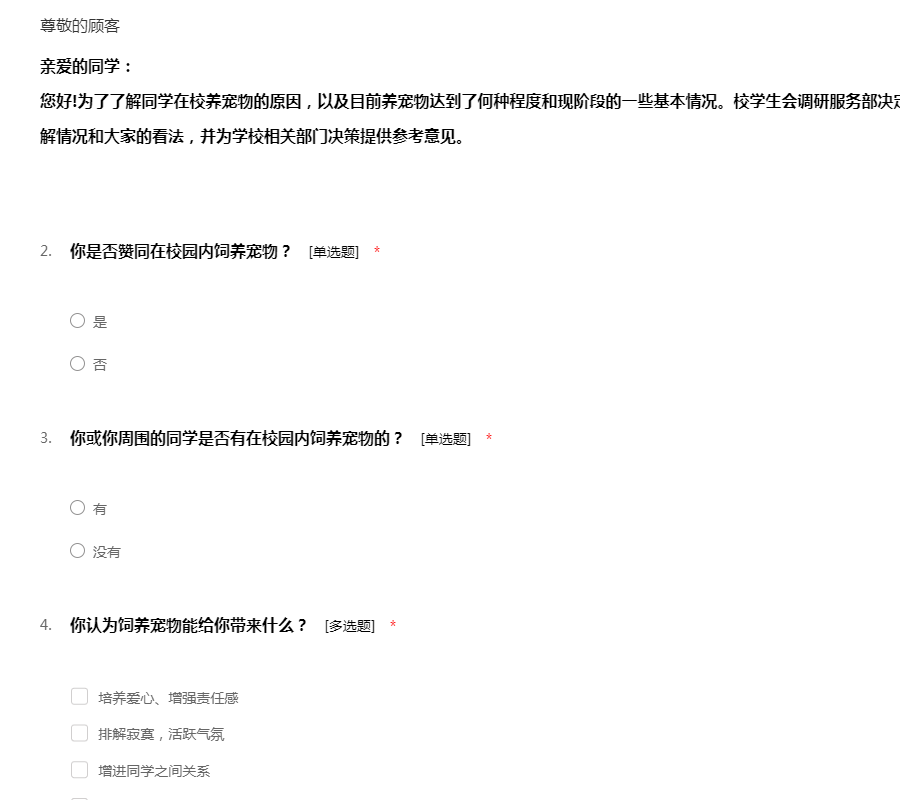 亲爱的同学: 您好!为了了解同学在校养宠物的原因,以及目前养宠物达到了何种程度和现阶段的一些基本情况。校学生会调研服务部决定做有关养宠物现象的调查,以便了解情况和大家的看法,并为学校相关部门决策提供参考意见。