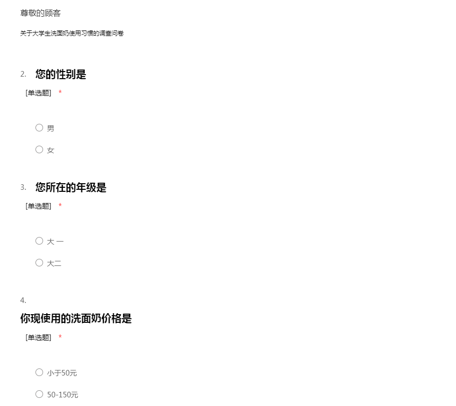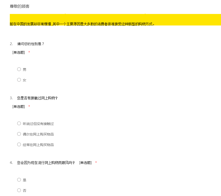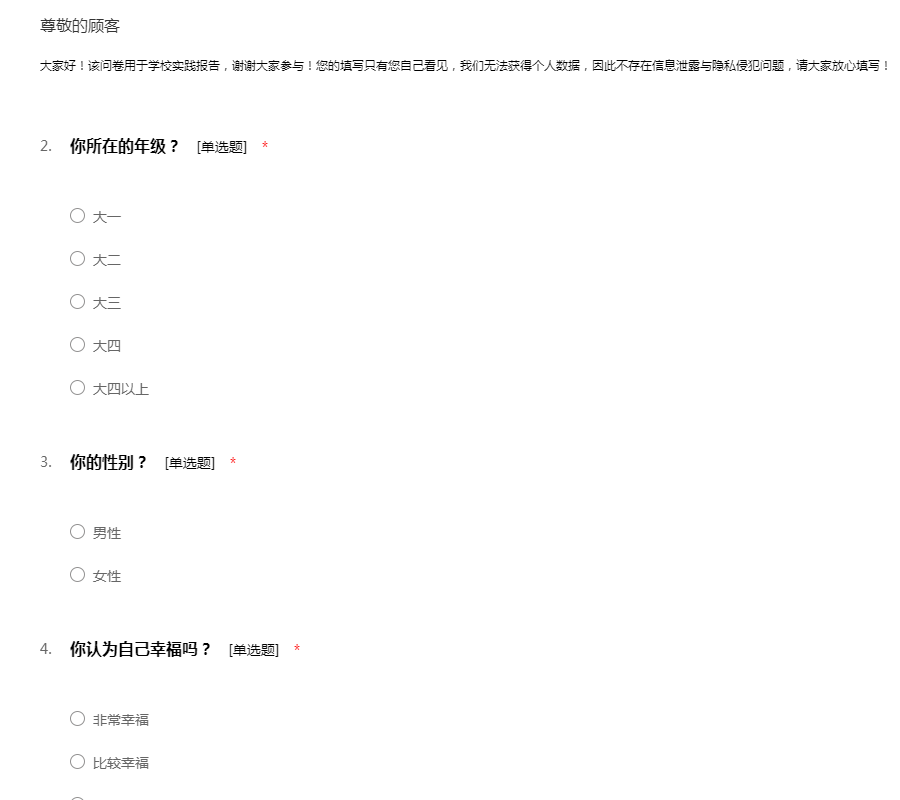 大家好!该问卷用于学校实践报告,谢谢大家参与!您的填写只有您自己看见,我们无法获得个人数据,因此不存在信息泄露与隐私侵犯问题,请大家放心填写!