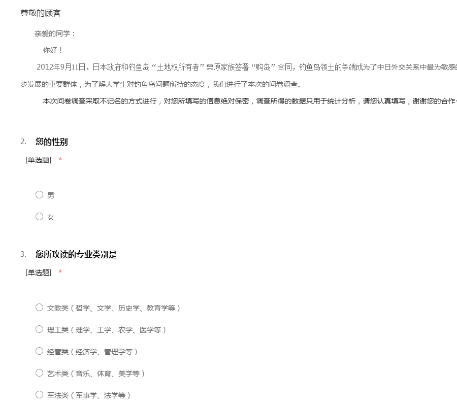 亲爱的同学: 你好! 2012年9月11日,日本政府和钓鱼岛“土地权所有者”栗原家族签署“购岛”合同,钓鱼岛领土的争端成为了中日外交关系中最为敏感的一个问题。当代大学生作为社会国家进步发展的重要群体,为了解大学生对钓鱼岛问题所持的态度,我们进行了本次的问卷调查。 本次问卷调查采取不记名的方式进行,对您所填写的信息绝对保密,调查所得的数据只用于统计分析,请您认真填写,谢谢您的合作~