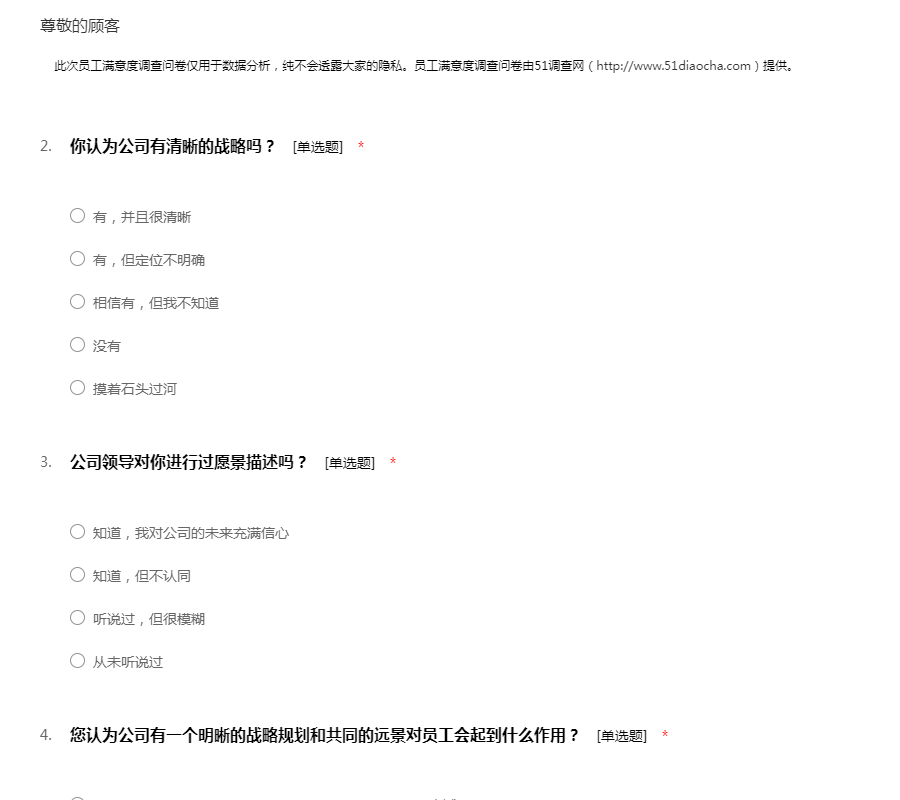 此次员工满意度调查问卷仅用于数据分析,纯不会透露大家的隐私。员工满意度调查问卷由51调查网(http://www.51diaocha.com)提供。