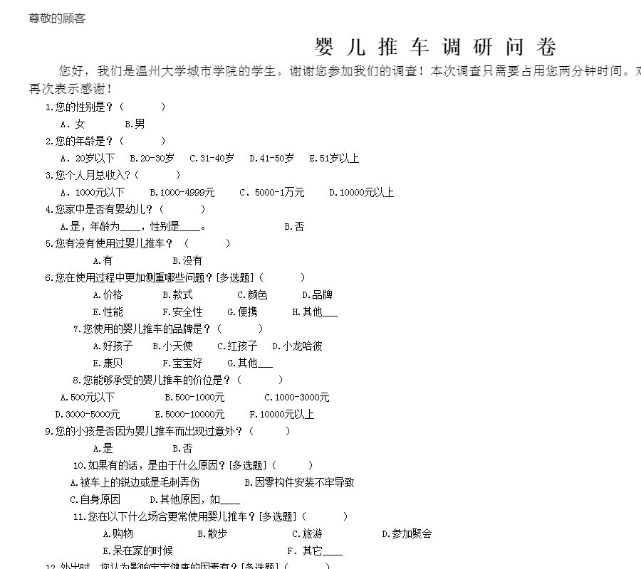 您好,我们是温州大学城市学院的学生。谢谢您参加我们的调查!本次调查只需要占用您两分钟时间。对于您能在百忙之中填写此问卷再次表示感谢!