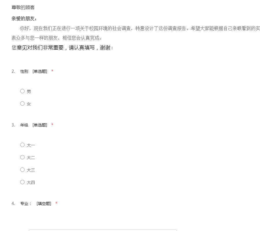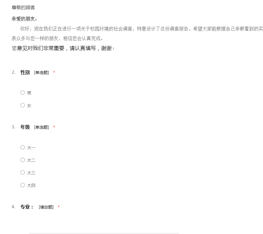 亲爱的朋友: 你好,现在我们正在进行一项关于校园环境的社会调查,特意设计了这份调查报告。希望大家能根据自己亲眼看到的实际情况来填写本报告。您的回答将代表众多与您一样的朋友,相信您会认真完成。 您意见对我们非常重要,请认真填写,谢谢!