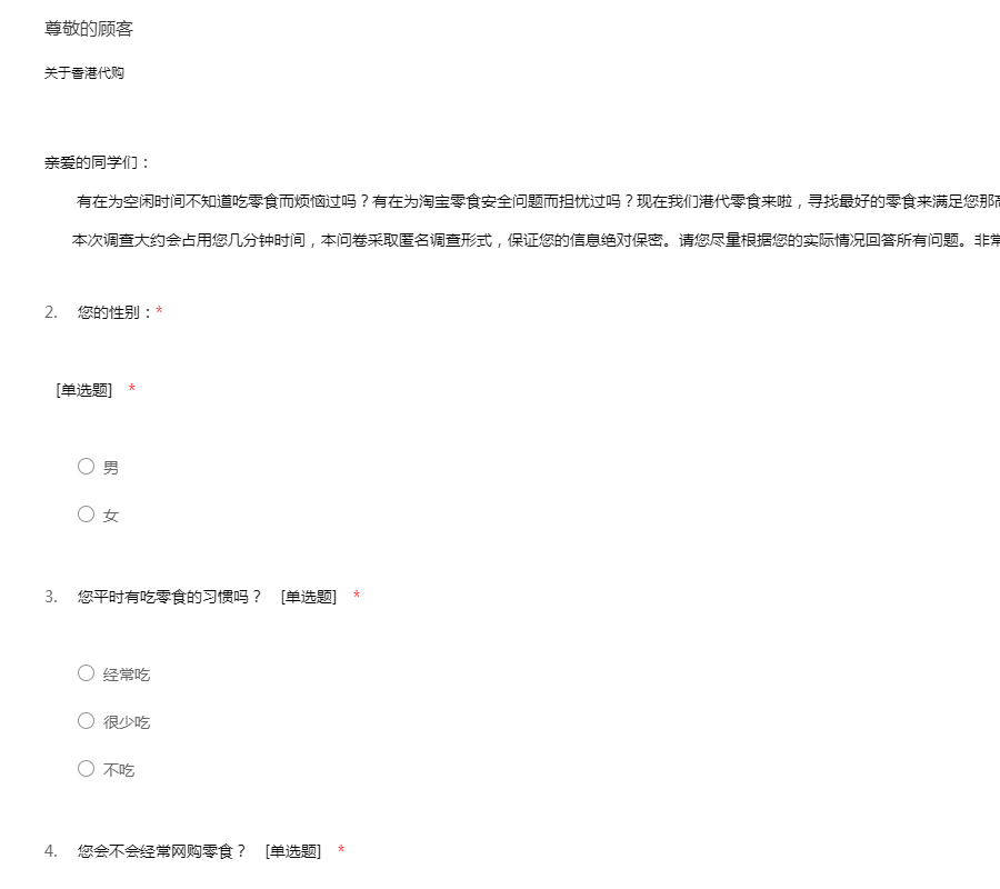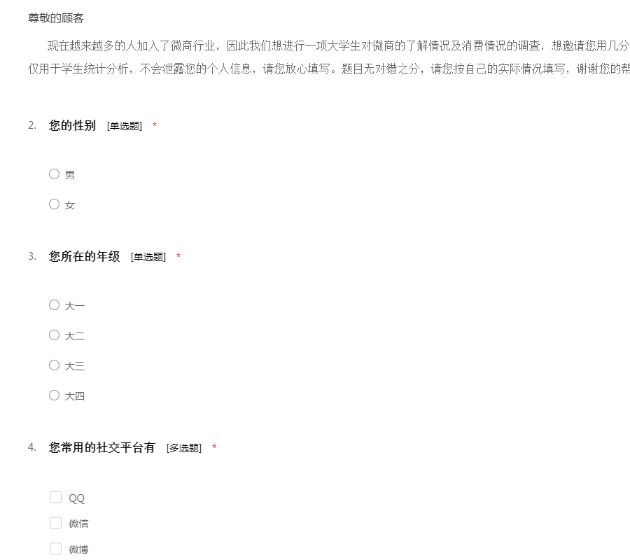 大家好,我们是琼台师专的学生。现在越来越多的人加入了微商行业,因此我们想进行一项大学生对微商的了解情况及消费情况的调查,想邀请您用几分钟时间帮忙填答这份问卷,本次问卷仅用于学生统计分析,不会泄露您的个人信息,请您放心填写。题目无对错之分,请您按自己的实际情况填写,谢谢您的帮助。