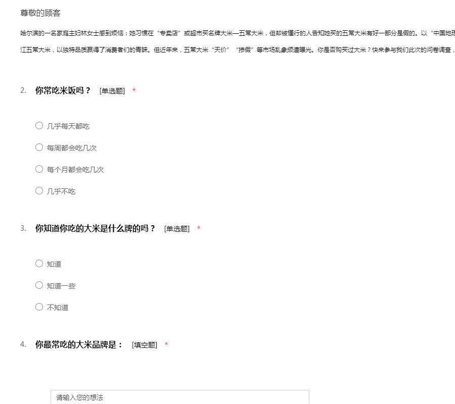 哈尔滨的一名家庭主妇林女士感到烦恼:她习惯在“专卖店”或超市买名牌大米—五常大米,但却被懂行的人告知她买的五常大米有好一部分是假的。以“中国地理标志保护产品”和“中国名牌产品”著称的黑龙江五常大米,以独特品质赢得了消费者们的青睐。但近年来,五常大米“天价”“掺假”等市场乱象频遭曝光。你是否购买过大米?快来参与我们此次的问卷调查,说出你的看法吧!