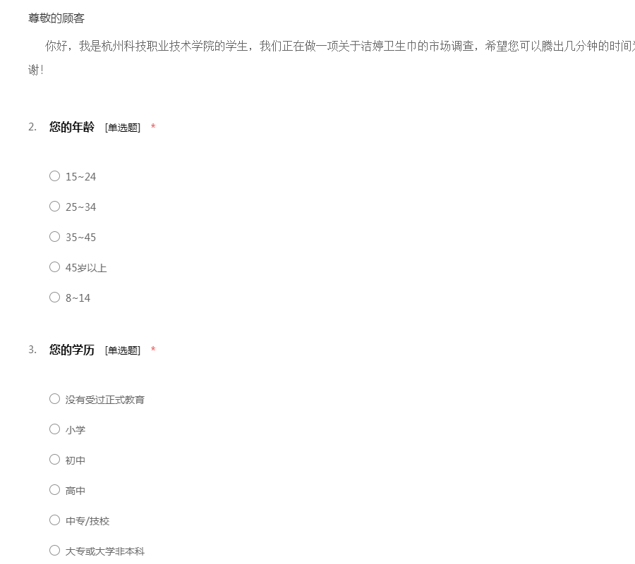 你好,我是杭州科技职业技术学院的学生,我们正在做一项关于洁婷卫生巾的市场调查,希望您可以腾出几分钟的时间为我们提供您的宝贵意见,十分感谢!