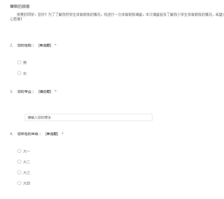亲爱的同学:您好!为了了解我校学生体育锻炼的情况,现进行一次体育锻炼调查。本次调查旨在了解我小学生体育锻炼的情况,希望大家积极配合共同完成此次调查问卷,衷心感谢!
