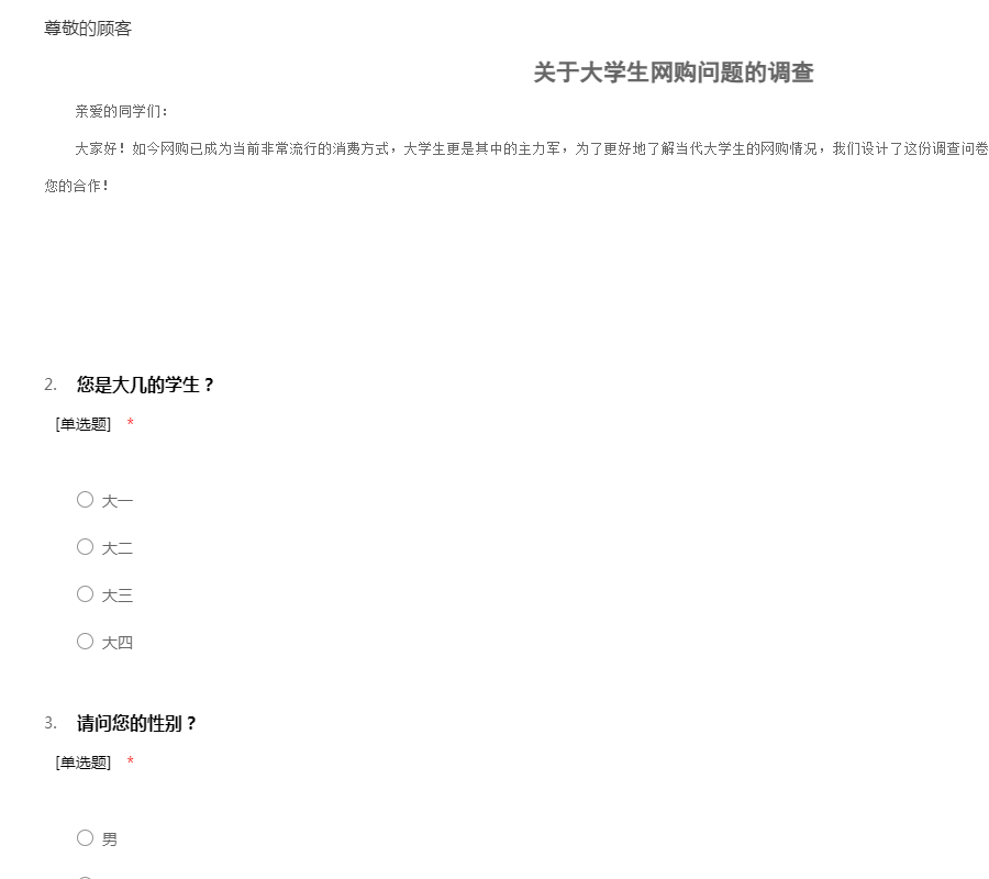 关于大学生网购问题的调查 亲爱的同学们: 大家好!如今网购已成为当前非常流行的消费方式,大学生更是其中的主力军,为了更好地了解当代大学生的网购情况,我们设计了这份调查问卷,麻烦您在百忙之中给予帮助和支持,谢谢您的合作!
