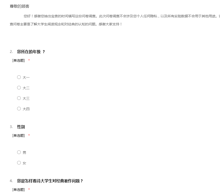 您好!感谢您抽出宝贵的时间填写这份问卷调查。此次问卷调查不会涉及您个人任何隐私,以及所有实验数据不会用于其他用途。请您放心填写本次大学生经典阅读市场调查问卷主要是了解大学生阅读观念和对经典的认知的问题。感谢大家支持!